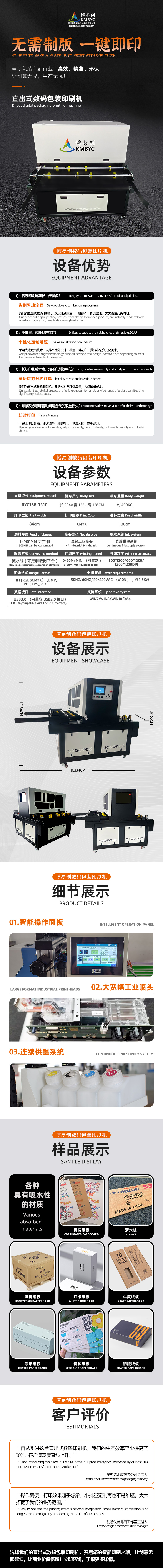 產(chǎn)品介紹: 博易創(chuàng)紙箱數(shù)碼打印機(jī)采用惠普品牌噴頭。進(jìn)料寬度為130cm,打印寬度為84cm。打印各種紙箱可以不用制版,適合小批量紙箱印刷廠家。